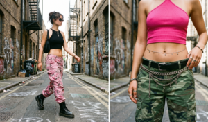Accessories are crucial for nailing this look: think chain belts worn low on the hips, delicate belly chains (yes, those are back), and dog tag necklaces. Footwear options include chunky platform sneakers like Buffalo shoes or combat boots for an edgier vibe. This outfit walks the line between street style and club wear, making it perfect for music festivals or casual nights out. To balance the Y2K edge with modern sensibilities, you can pair the camo cargos with a simple black crop top instead of going full-throttle with patterns and textures. The key is confidence—this look is bold and unapologetic.