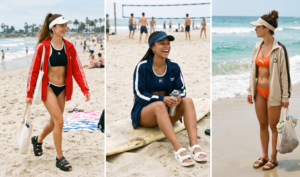 The athletic-luxe trend was huge in Y2K fashion, and it translated beautifully to beach wear. A sporty bikini top (think racerback or crop-top style) paired with a vintage-style track jacket creates an unexpected beach outfit that’s uniquely early 2000s. The bikini should feature brand logos, racing stripes, or color-blocking in the style of athletic wear brands like Adidas, Puma, or Fila.